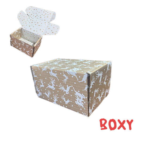 Коробка з мікрогофрокартону, розмір: зовнішній - 170х120х100 мм., внутрішій -160*110*100 мм., друк на білому, середина коробки - зірки, зовні друк - олені , конструкція - самозбірна, марка картону Т-23ББМ(В).