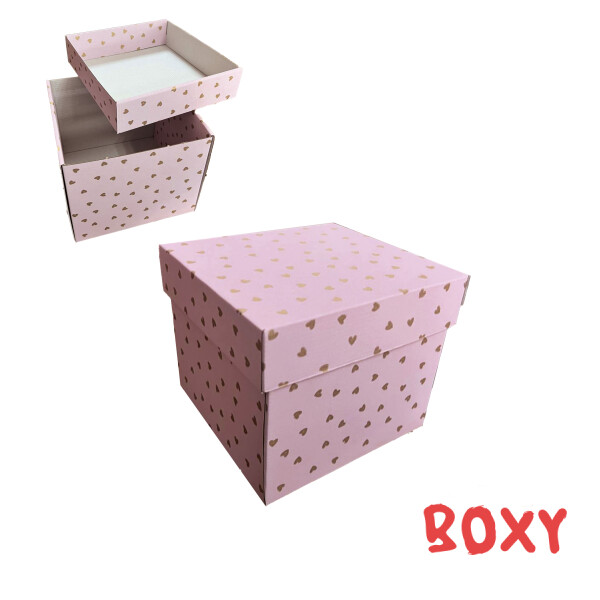 Коробка 190*190*170 мм (повна заливка) рожева + (міні серця) золото