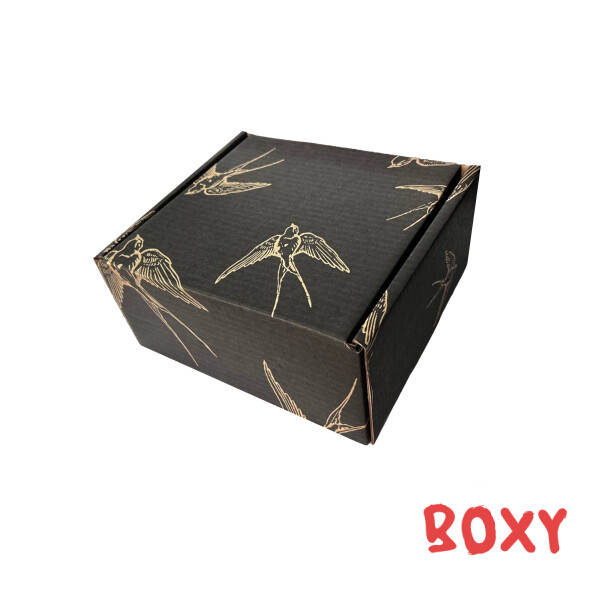 Коробка з гофрокартону: розмір 210*205*105 мм, повна заливка чорна + задрук золотом (ластівки), середина коробки - крафт, конструкція - самозбірна,