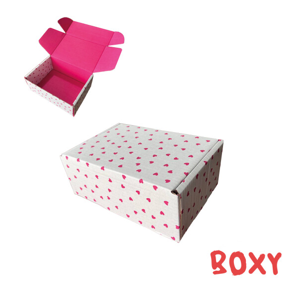 Коробка з мікрогофрокартону, розмір: зовнішній - 240х170х100 мм., внутрішій -230*160*90 мм., друк на білому в серця пан.маджента - ззовні. Середина виробу - повна заливка пан.маджента Конструкція - самозбірна.
