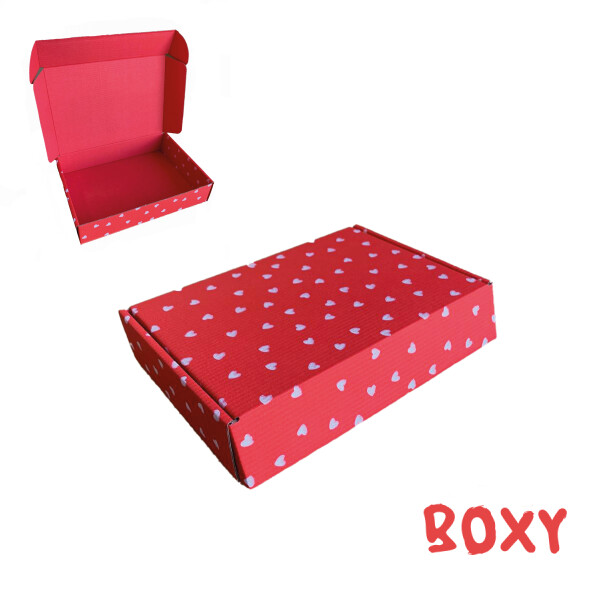 Коробка з мікрогофрокартону, розмір: зовнішній - 170х120х100 мм., внутрішій -160*110*100 мм., друк на білому червоним, + білі серця зовні. Середина виробу - біла. Конструкція - самозбірна.