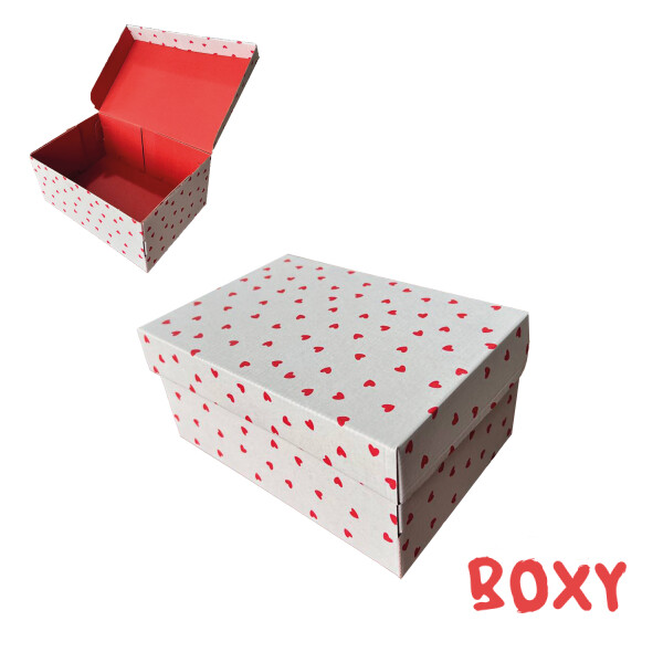 Коробка з мікрогофрокартону: розмір 250*170*110 мм, друк на білому. Верх виробу - міні серця червоні на білому. Середина - повна заливка червона. Пантон 032. Конструкція - самозбірна, марка картону Т22ЕЕ (Е).