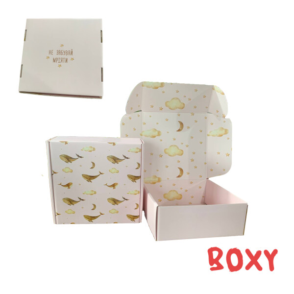 Коробка з кашированного мікрогофрокатону, розмір: 250*250*100 мм, з друком, присутня матова ламінація, середина коробки задрукована.