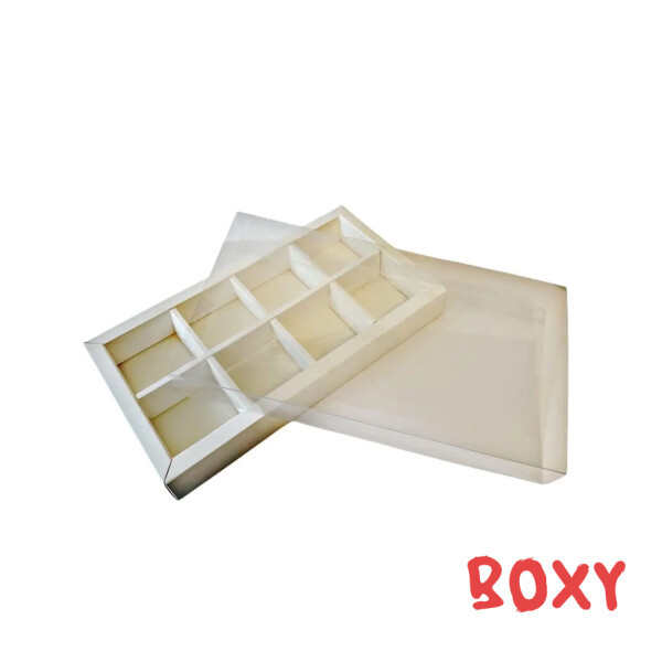 Коробка з хром-ерзацу, колір -біла, зовнішній розмір - 285*155*40 мм., внутрішній розмір - 258*128*35 мм., конструкція - пенал. Продається з вкладками, розмір квадратику - 60*60 мм. .
