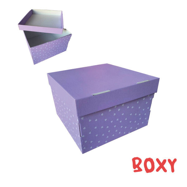 Коробка з мікрогофрокартону, розмір 300*300*200 мм. Конструкція кришка+дно. Зовні друк пан.2645(лаванда) + міні серця білі. Середина виробу - біла.