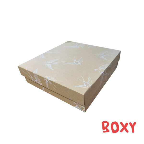 Коробка з мікрогофрокартону: розмір: 330*330*100 мм, зовні друк ластівки білі на крафті, сердина виробу - крафт. Конструкція кришка+дно.