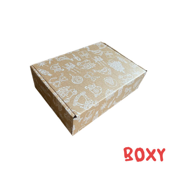 Коробка з мікрогофрокартону, розмір: зовнішній - 340х240х100 мм., внутрішій -330*230*100 мм., друк на целюлоза-крафт, пантон -322С (смарагд), середина коробки - візерунок зірки, зовні друк - новорічний візерунок , конструкція - самозбірна, марка картону Т