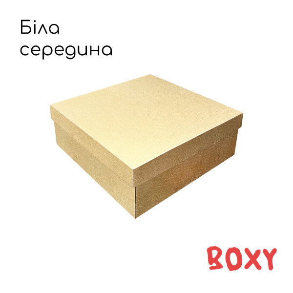 Коробка з мікрогофрокартону (віночок): розмір 400*400*150 мм, пантон - золото, середина коробки - крафт (целюлоза), марка картону Т23БЕМ (Е). Примітка: Оброблена спеціальним напиленням, частково може залишатись на руках.
