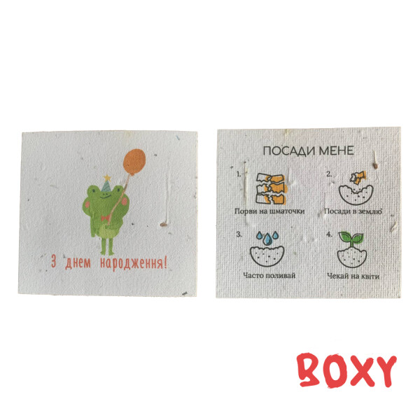 Квітуча листівка, з друком, розмір - 70*65 мм. Примітка: Цю листівку не потрібно викидати, її можна посадити. В листівці присутні насіння квітів: чорнобривці, петунії, маку та портулаку.